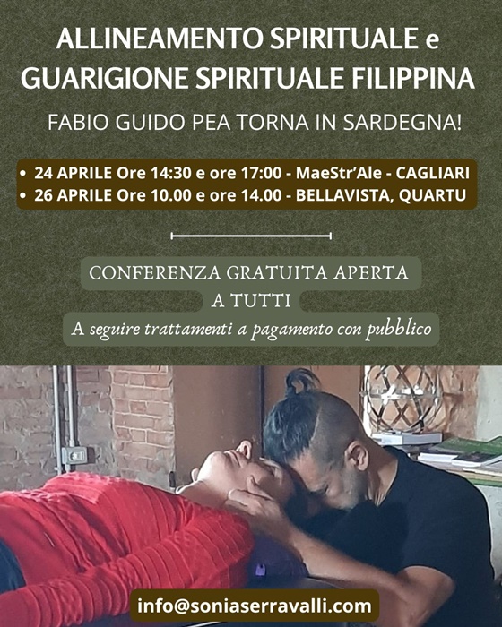 Allineamento spirituale (con in omaggio la prima guarigione spirituale filippina) ha un costo di 150 Euro (140 euro per i Soci MaeStr’Ale) a persona (inclusa una carta di riprogrammazione cellulare, che spiegheremo), da corrispondere in loco (contanti con me o carte di credito con Fabio).