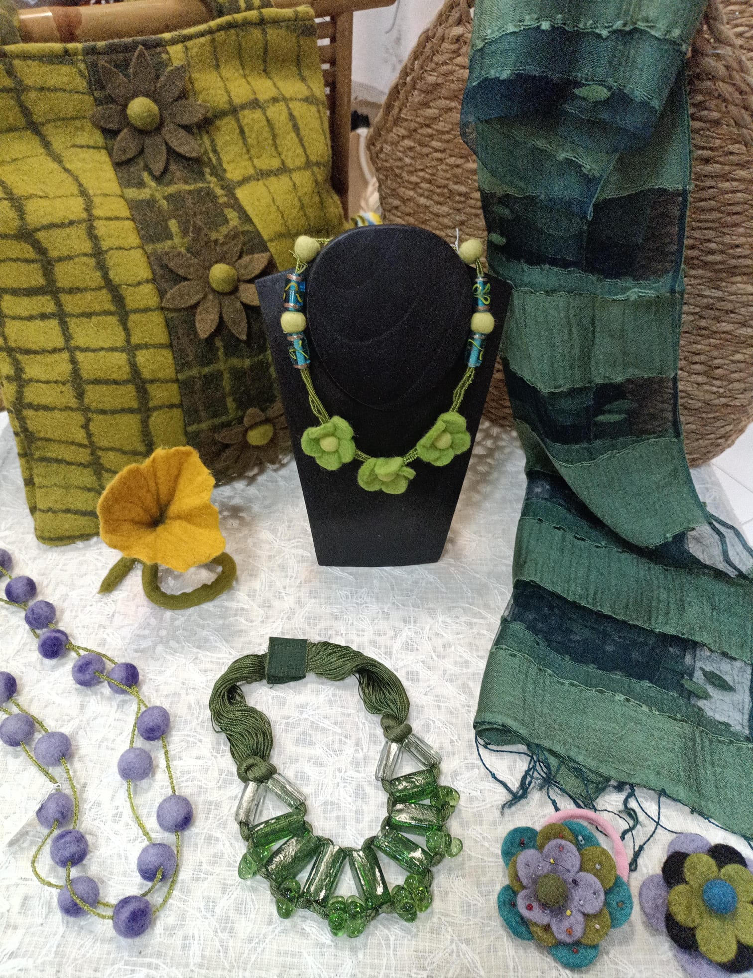 Collane in fili di seta grezza e vetro soffiato…, in perline di vetro e di lana melangiata…. , elastici per i capelli…