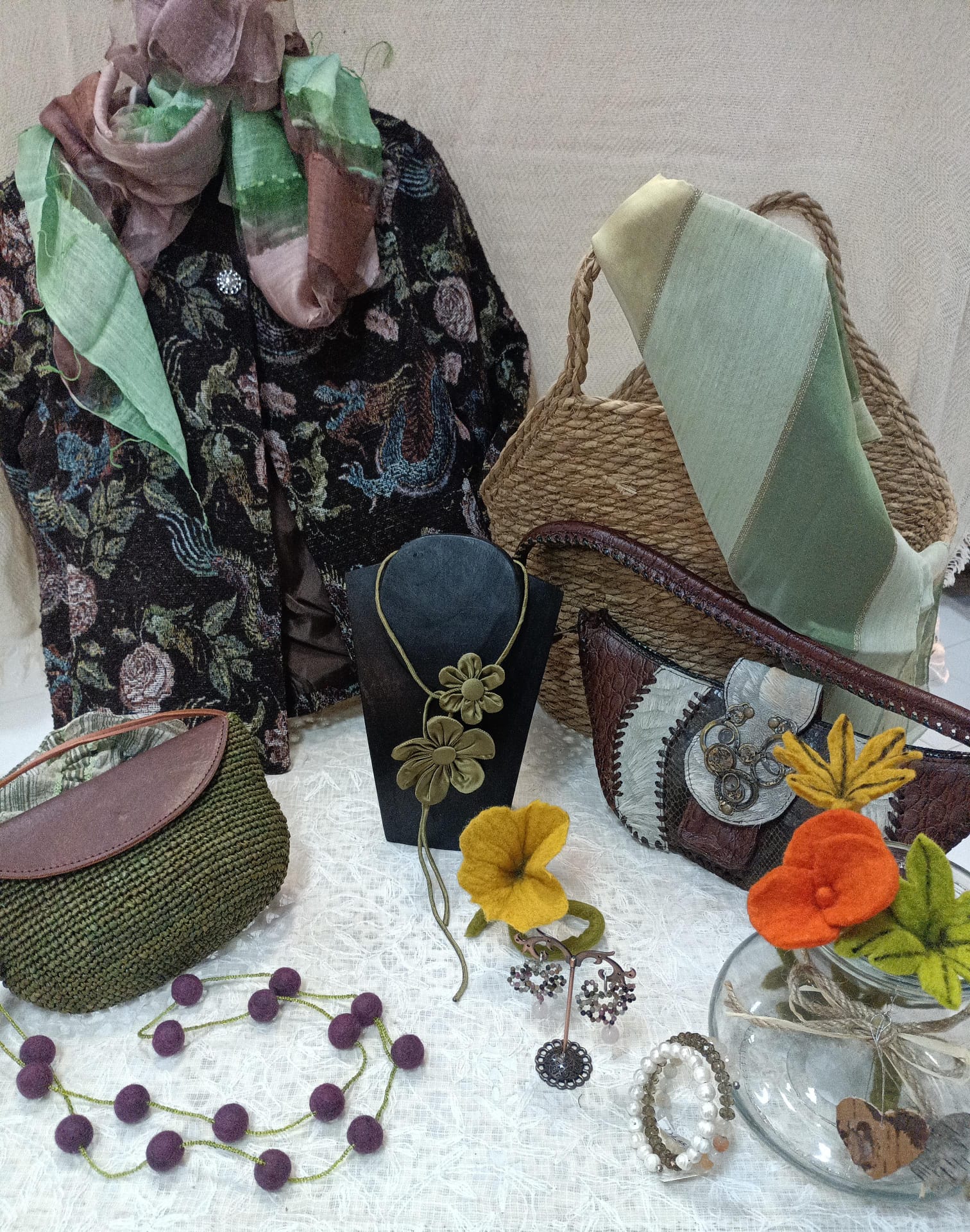 Giacchina in broccato , collana con fiori di seta realizzati a mano, pochette in rafia e cuoio, orecchini artigianali con perline di vetro e quarzi, originale borsa in pelle di rettili e pellami in pelo…, bracciale a spirale in perle, quarzo e cangianti perline di vetro sfaccettato…